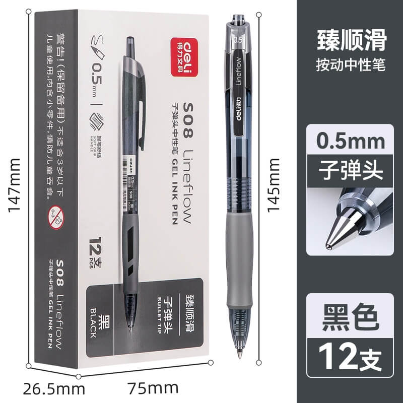 / 得力笔按动S08中性笔0.5黑色水性笔 办公首选 1盒(12支装)